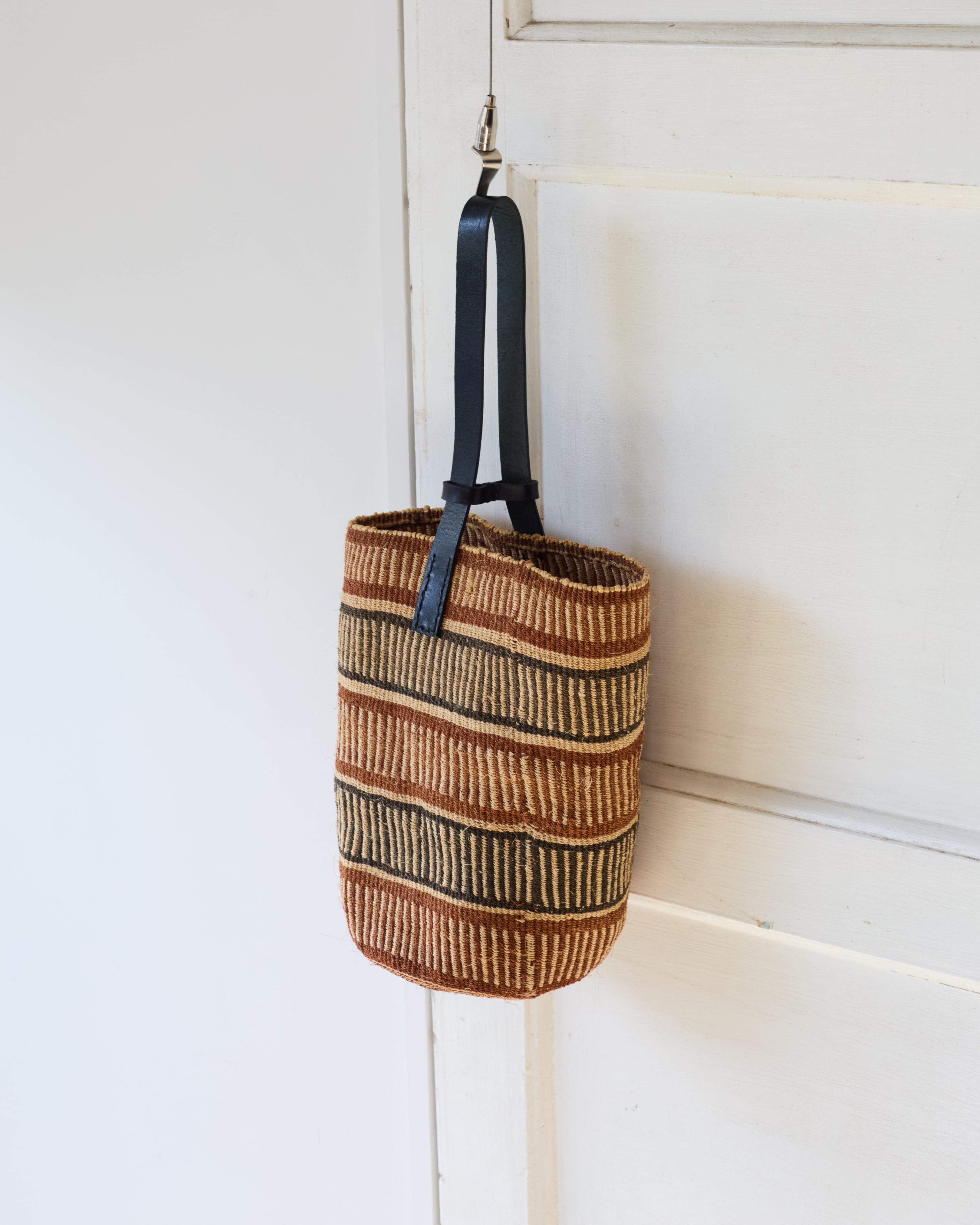 サイザルとレザーを使用したワンハンドルかごバッグ。