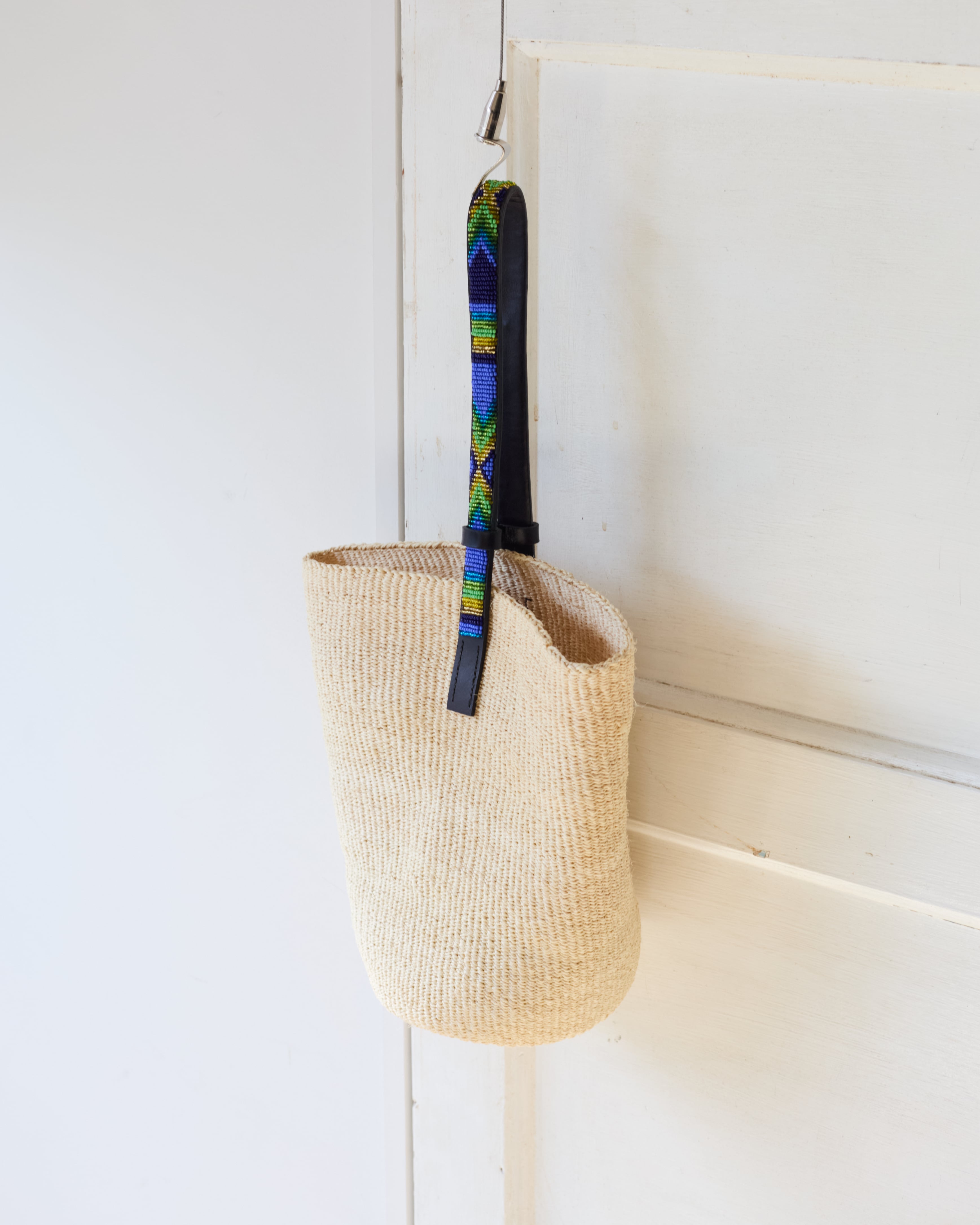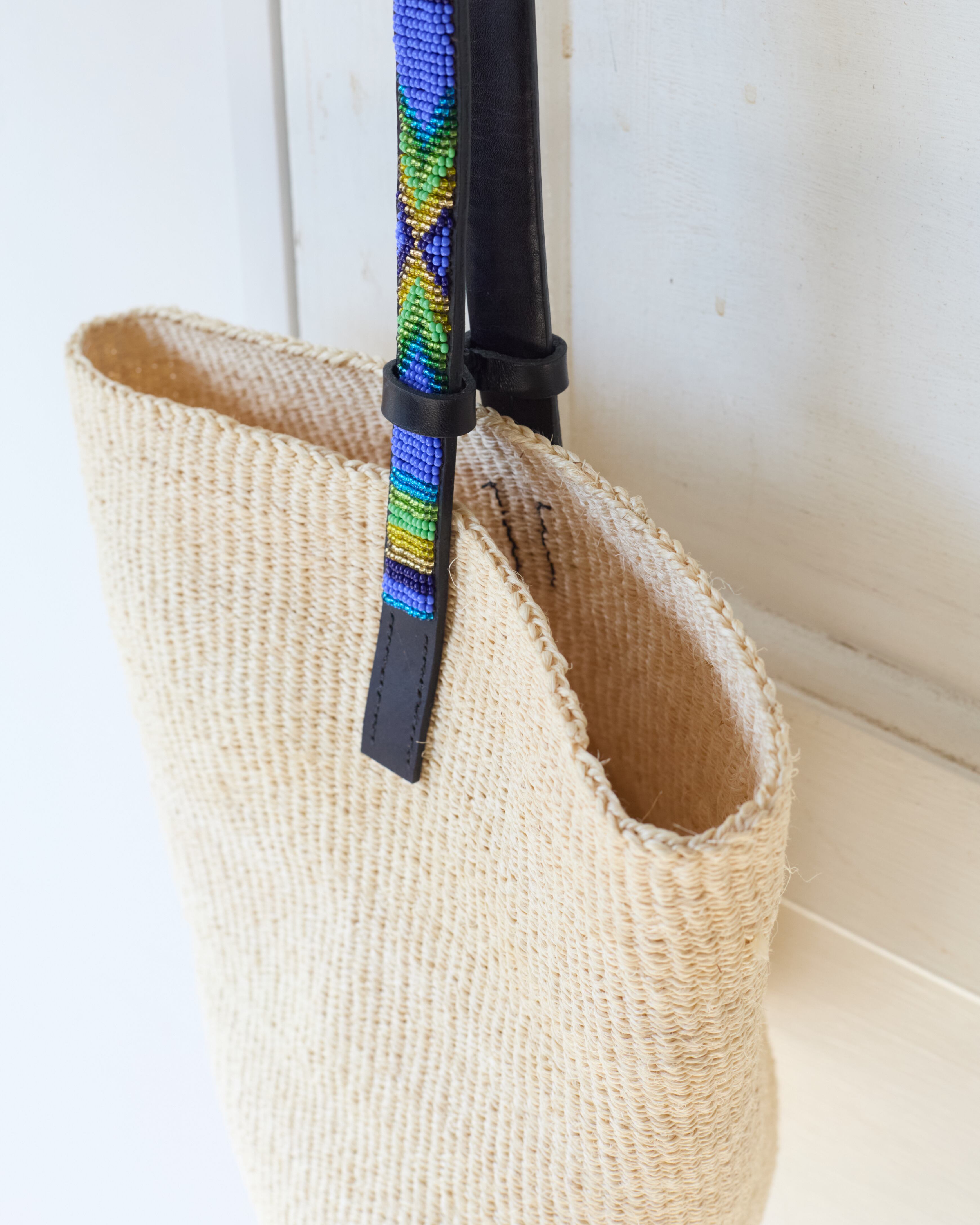 サイザルとビーズのストラップを使用したワンハンドルかごバッグ。