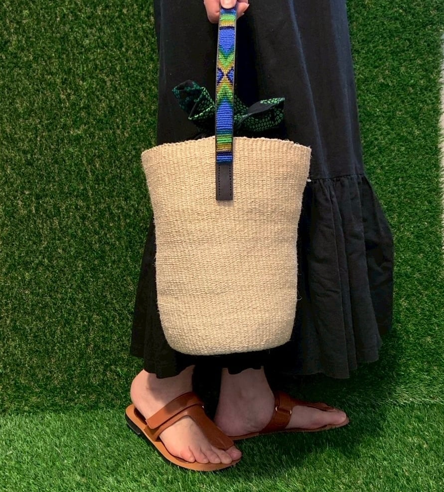 ケニアのタイタ地区の農家のお母さんによって、伝統的な手法で丁寧に編まれたサイザルバッグは、一般的によく見られるサイザルバッグより、より細く撚られたサイザル麻を時間をかけて丹念に編み込み、手仕事の温かみが感じられます。また、キクユ族の職人によるビーズ刺繍が施されたハンドルは、色とりどりのビーズが美しく配され、バッグ全体に華やかさを添えています。現地で縫製された取り外し可能なアフリカ布の巾着も付属しており、収納力も抜群!日常使いはもちろん、少しおしゃれしたお出かけのお供に、ぜひお手元に迎えてみてはいかがでしょうか。