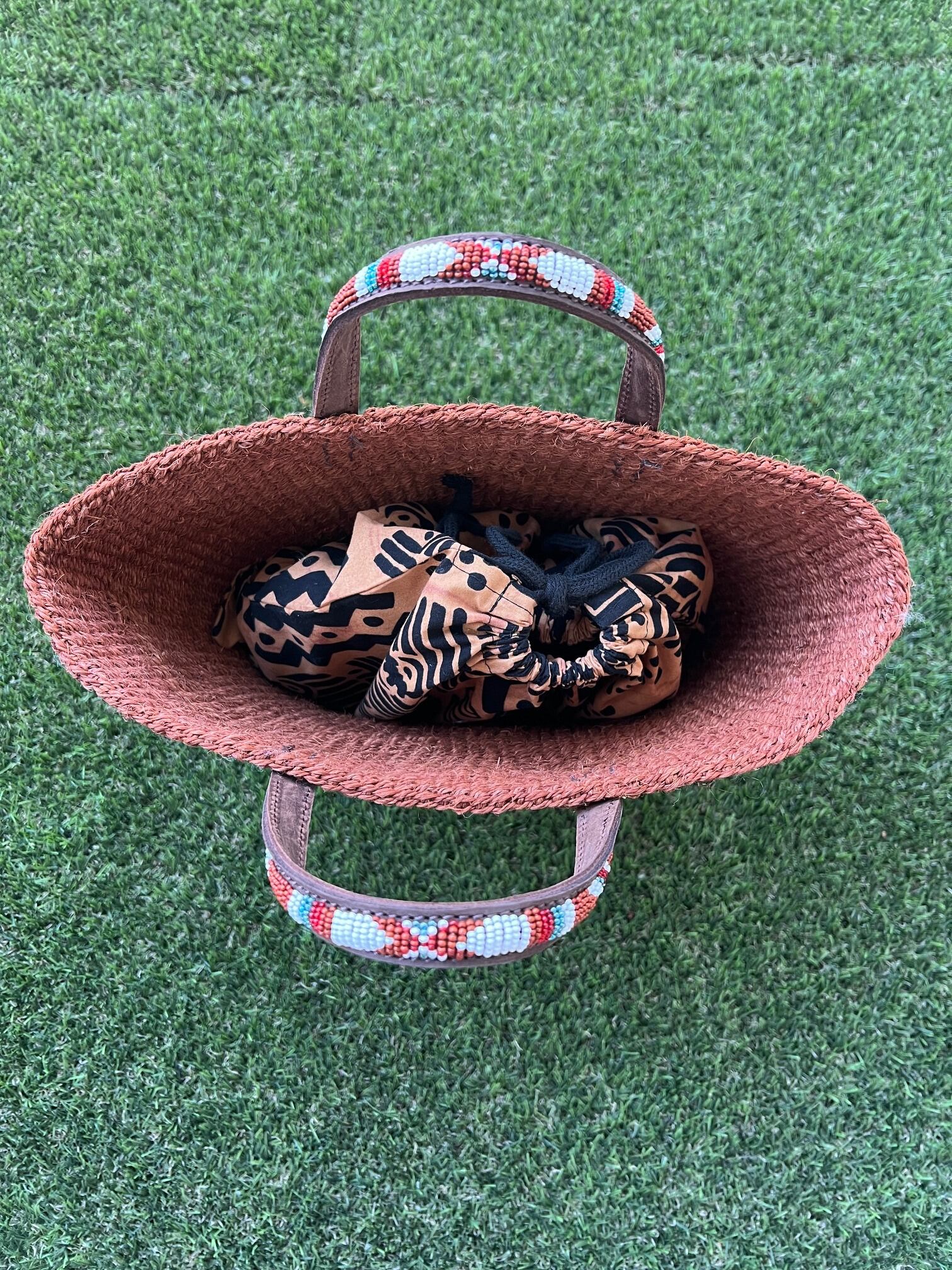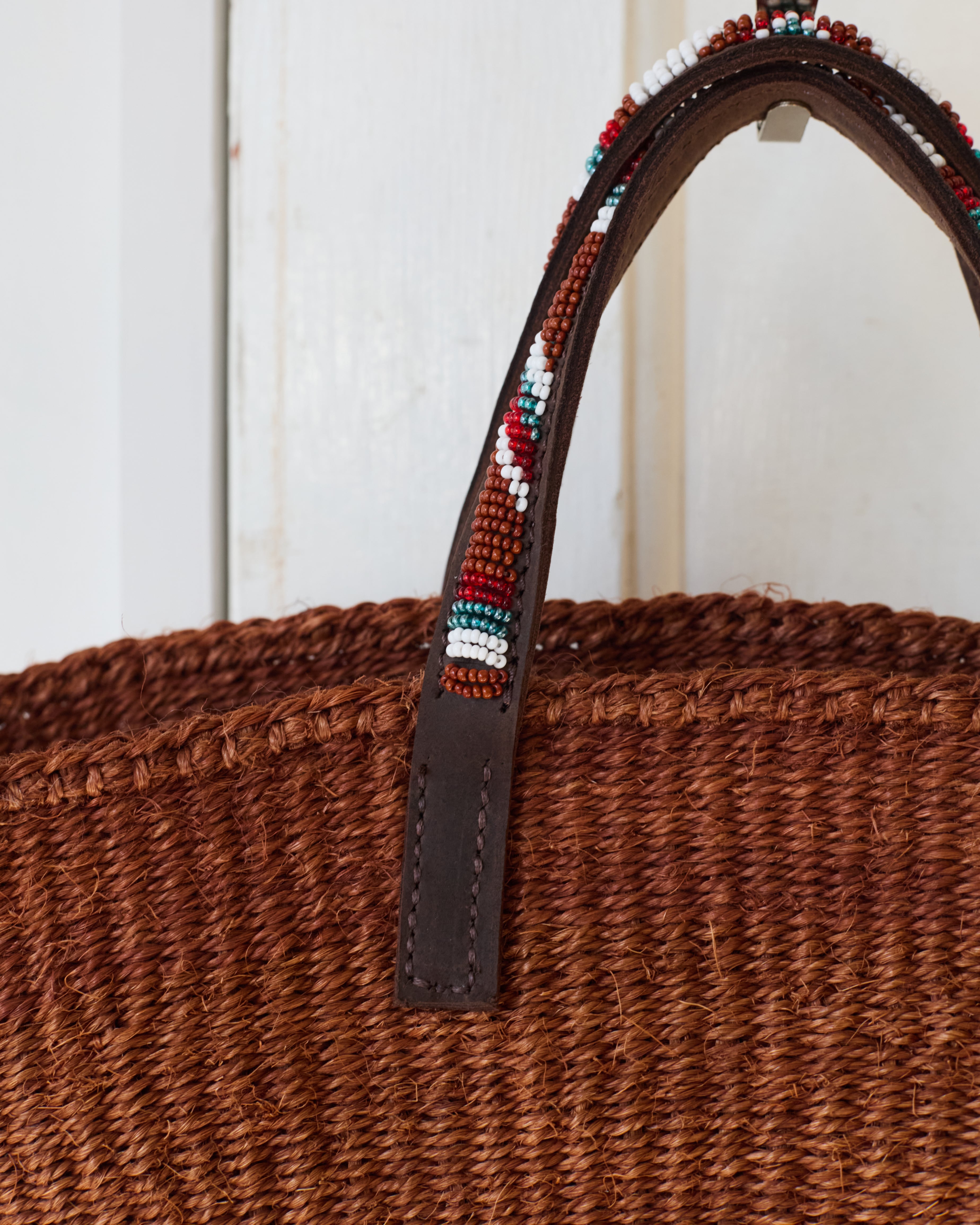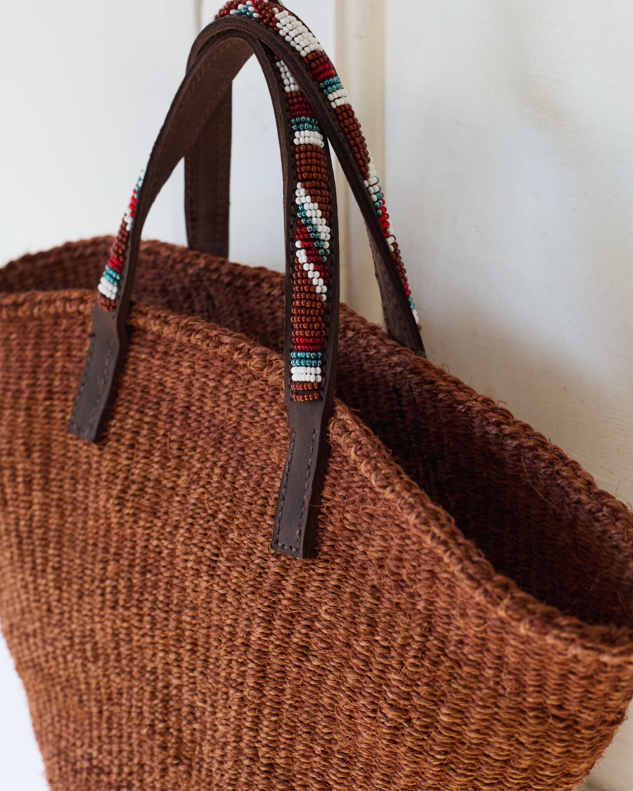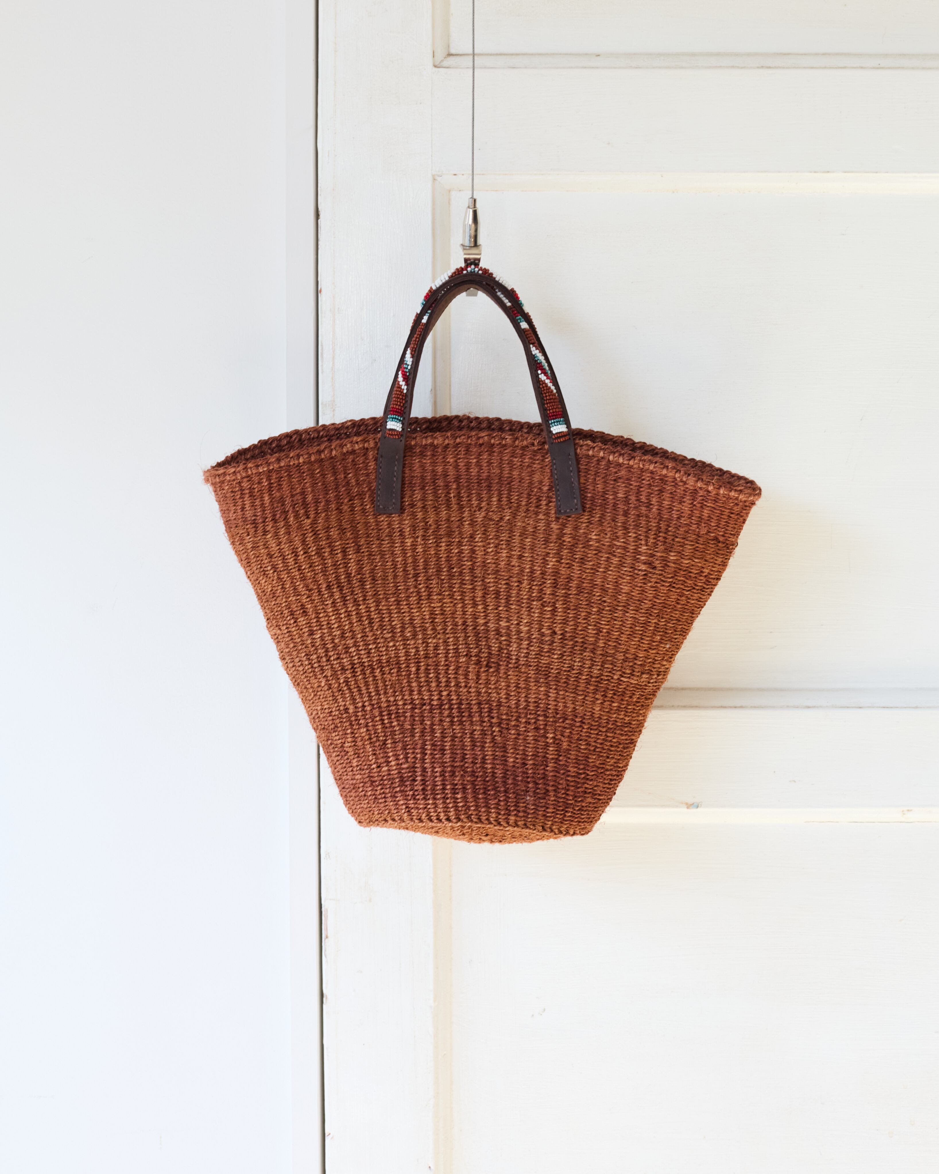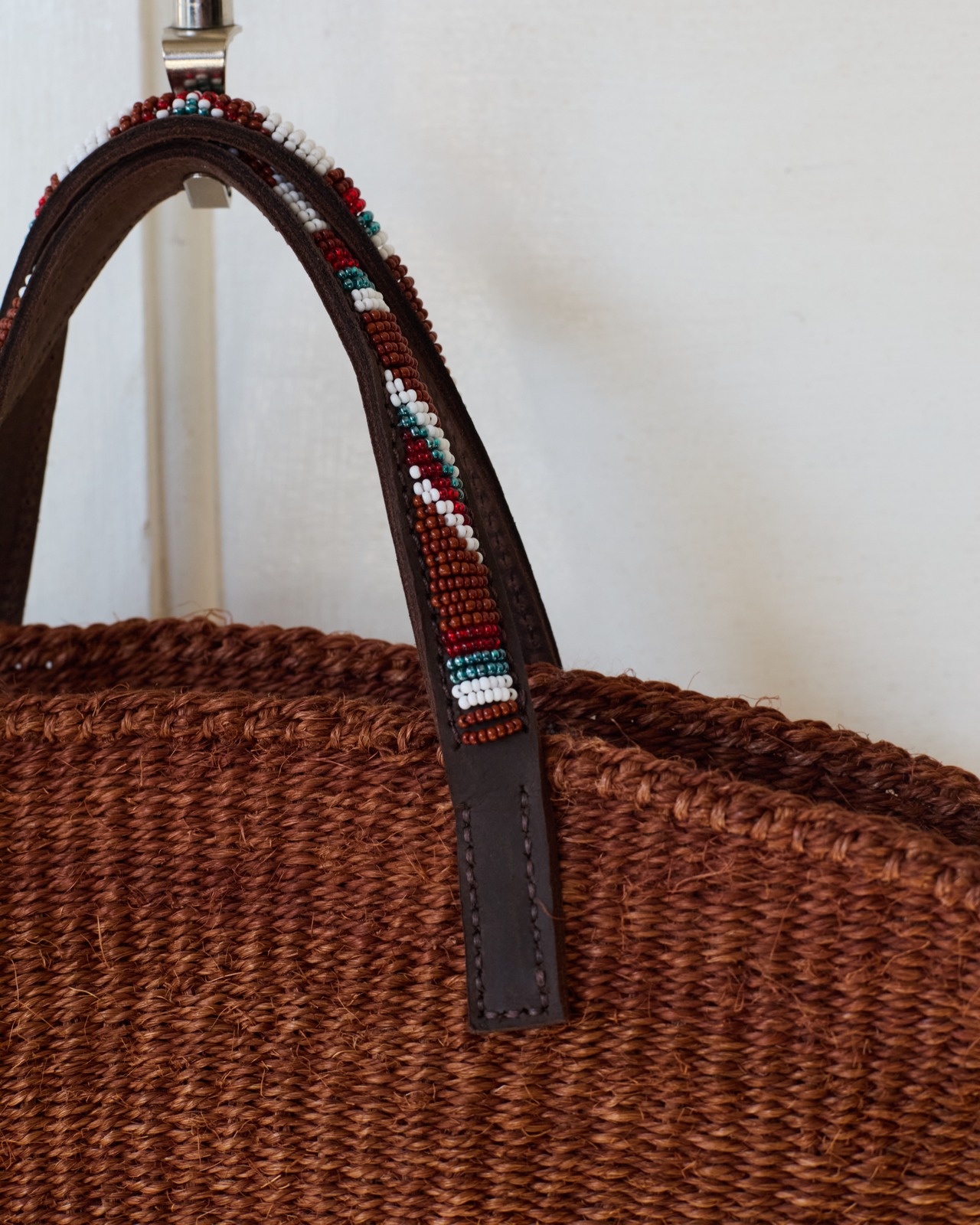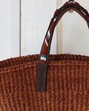 自然の恵みを生かした、ケニアのバナナファイバー x ビーズのカゴバッグです。タイタタベタ地区で、バナナの幹を使用して手作りされており、独特の風合いと温かみがあります。草木染めによる独特なブラウンで1点1点微妙に色合いが異なります。